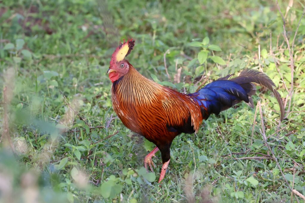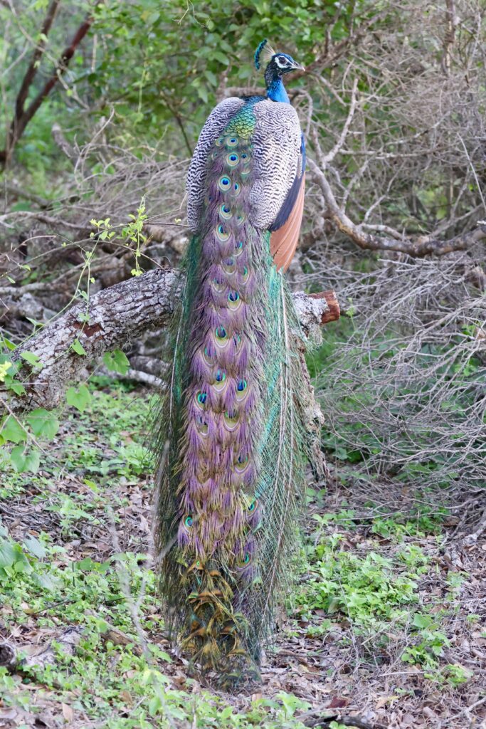 The package was for three nights, three safaris with breakfast and lunch included. On our safaris we chose one day to Yala National Park where we saw elephants, a leopard and other large mammals not to mention plenty of birds. Yala was a terrific experience. Our bird list had 67 species. The list included the Gray-bellied Cuckoo, my 2000th life bird. Other highlights included the endangered, Black-necked Stork and Sirkeer Malkoha, close looks at Sri Lanka Junglefowl and a Gray Heron eating a 5’ snake who was desperately trying to escape. There was also a solid population of Indian Peafowl, that’s Peacock to most of you.