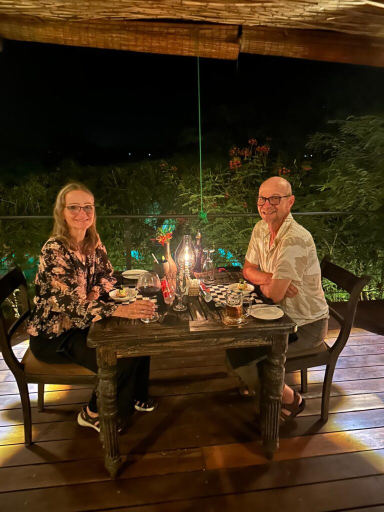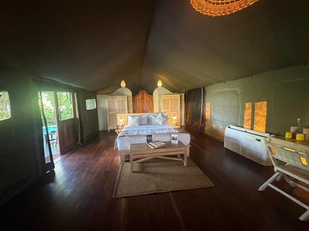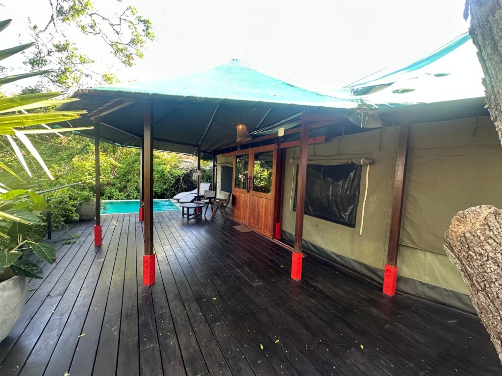 We arrived at the Red-backed Flameback Eco-Lodge shortly after check-in and were escorted to our honeymoon suite. Actually, the lodge is composed of about a dozen luxury tents with AC and in-suite bathrooms. Ours was substantially larger than the others and isolated for more privacy. We also had a king-size bed, a plunge pool and an amazing view over the lake.